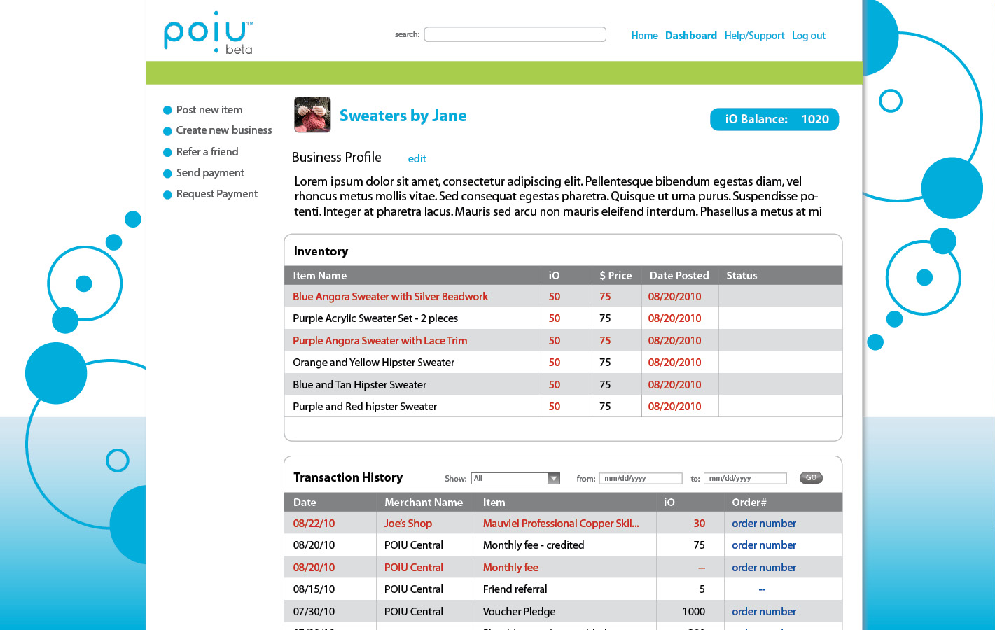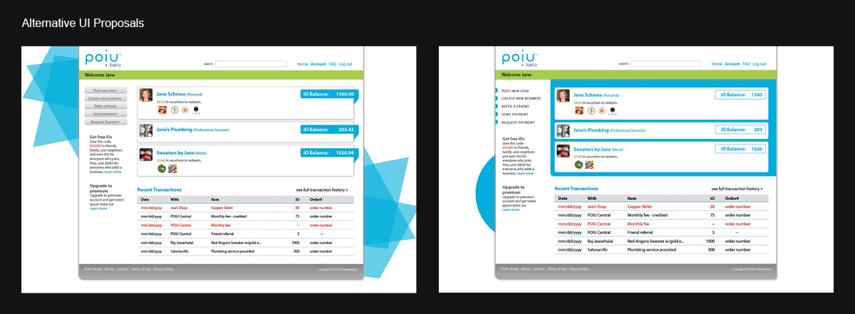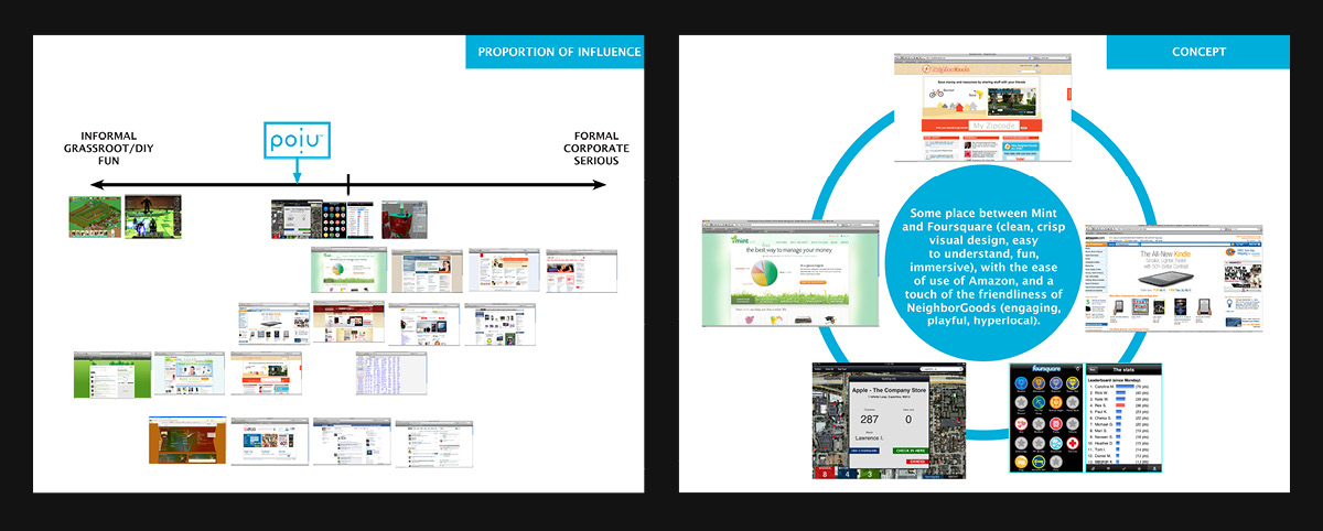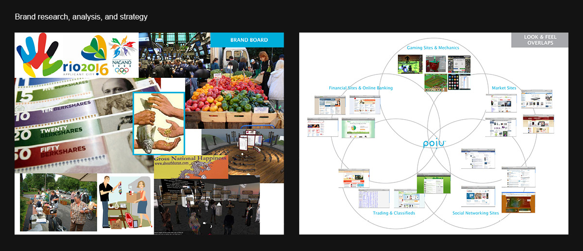 Solution: After looking at several different industries I determined that POiU ought to reside in the intersection of market/shopping apps, social networking sites, trading classifieds, financial and online banking, and gaming sites. The feel of the app should be one of a consumer site, friendly but not too informal while communicating reliability and trustworthiness.